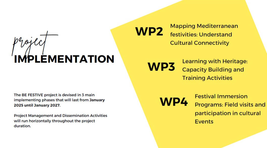 Be Festive aims to explore traditional cultural festivities across Mediterranean countries as a platform to enhance youth participation and raise awareness for the importance of in-tangible cultural heritage.Be Festive is a 24-month project, co-funded by the ERASMUS-YOUTH-2023-CB of the European Union.The specific objectives of the project are:• Develop a cultural map and educational resources that serve as tools for promoting diversity and inclusion.